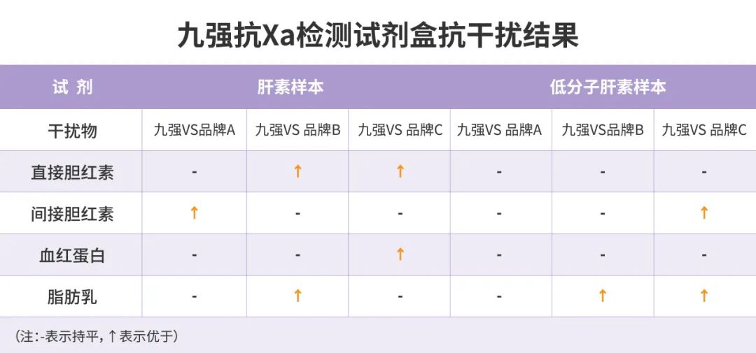 九強(qiáng)生物抗Xa檢測試劑盒多中心驗(yàn)證數(shù)據(jù)顯示:九強(qiáng)抗Xa檢測試劑盒抗干擾能力優(yōu)于進(jìn)口主流廠家配套試劑。九強(qiáng)試劑檢測普通肝素/低分子肝素樣本時,干擾物濃度低于以下濃度(直接膽紅素20mg/dl,間接膽紅素10mg/ml,血紅蛋白500mg/dl,脂肪乳400mg/dl)時無顯著干擾,回收率在90-110%。