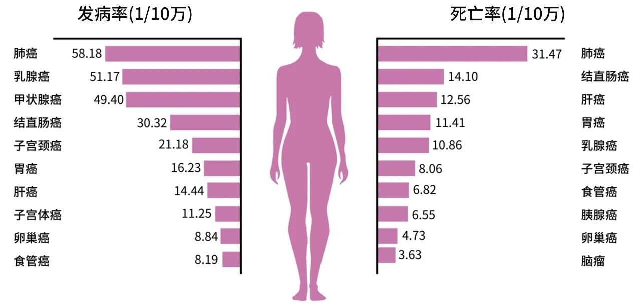 中國女性前十位惡性腫瘤發(fā)病率/死亡率及順位