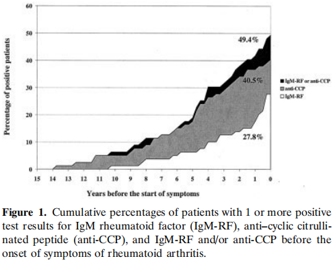 研究表明,Anti-CCP在患者首次RA癥狀出現(xiàn)前的14年前即可在血清中被監(jiān)測到,且具有一定的預(yù)測價(jià)值[2]。
